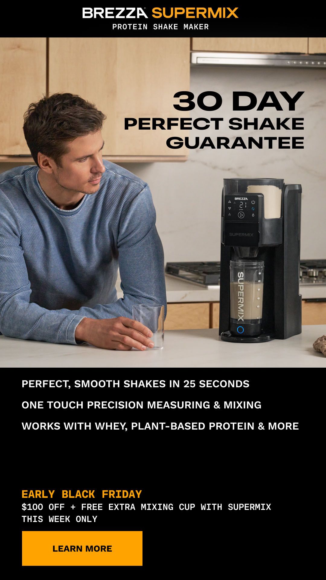 Meet the Brezza Supermix — the world’s first protein shake maker. It measures, dispenses, and mixes automatically, giving you precise, personalized shakes in under 30 seconds. And for this week only - give yourself an early Black Friday gift by claiming $100 off your Brezza Supermix plus a free extra mixer cup!